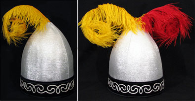 The 29th degree helmets are covered with silver metallic cloth to simulate armor. Made with either one gold ostrich feather at the top, or one each of gold and red. These helmets are made to be adjustable. Plate 225 Helmet, One Feather ..... $212.75 Plate 225 Helmet, Two Feathers ..... $222.50 |